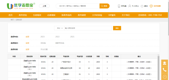 进入后,我们可以查询2021-2023三年的征集志愿信息,通过下方搜索框,我们可以根据院校或者专业名称进行快捷搜索。下方可以查看对应院校专业的征集志愿招生人数、学费、学制、投档线等相关信息