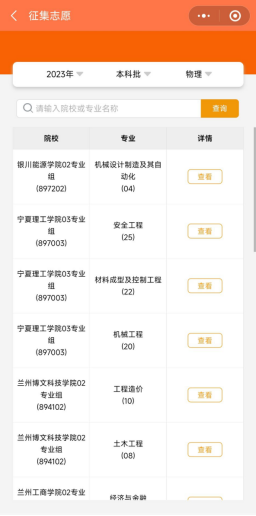 点击征集志愿模块按钮,即可进入征集志愿查询界面,在这里,我们可以查询2021-2023三年的征集志愿信息,通过下方搜索框,我们可以根据院校或者专业名称进行快捷搜索。点击对应的查看按钮,可以查看对应院校专业的征集志愿招生人数、学费、学制、投档线等相关信息,赶紧来体验一下吧!