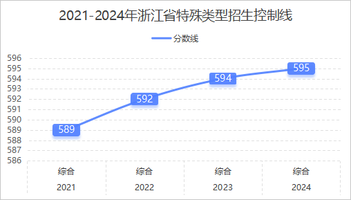 从2021年至2024年的数据来看,浙江高考特殊类型招生控制线(综合类)呈现出稳定上升的趋势。2021年为589分,2022年上升至592分,2023年达到594分,2024年继续微升至595分。这四年间分数线总体上升了6分,年均增长约2分,显示出浙江高考特殊类型招生控制线具有相当的稳定性。这种稳步上升的趋势可能反映了浙江高考竞争的持续激烈程度以及招生政策的稳定性。