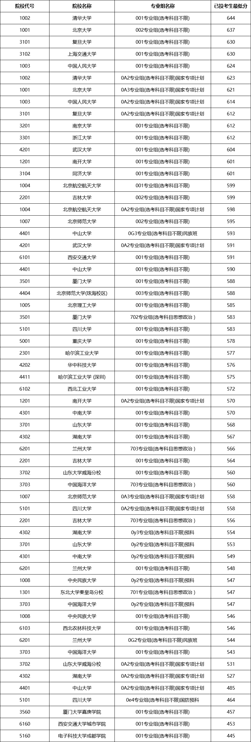 宁夏2025年高考39所985高校各专业投档分数线(历史类)