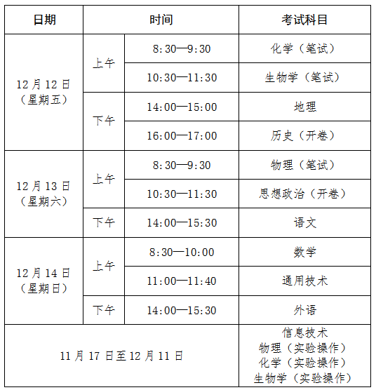 根据安排,考试首日(12月12日)将进行化学、生物、地理、历史四个科目的笔试。其中,历史科为开卷考试。次日(13日)进行物理、思想政治(开卷)、语文的考核。最后一天(14日)则集中考查数学、通用技术和外语。多数科目考试时长在60至90分钟之间。