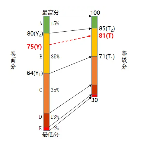 等级分的满分值为100分,起赋分值为30分。从A至E每个等级按1分1档的分数间隔进行连续赋分。等比例转换法则:根据考生的卷面分数及所在等级的等级分赋分区间,运用等比例转换法则将其卷面分换算成等级分。