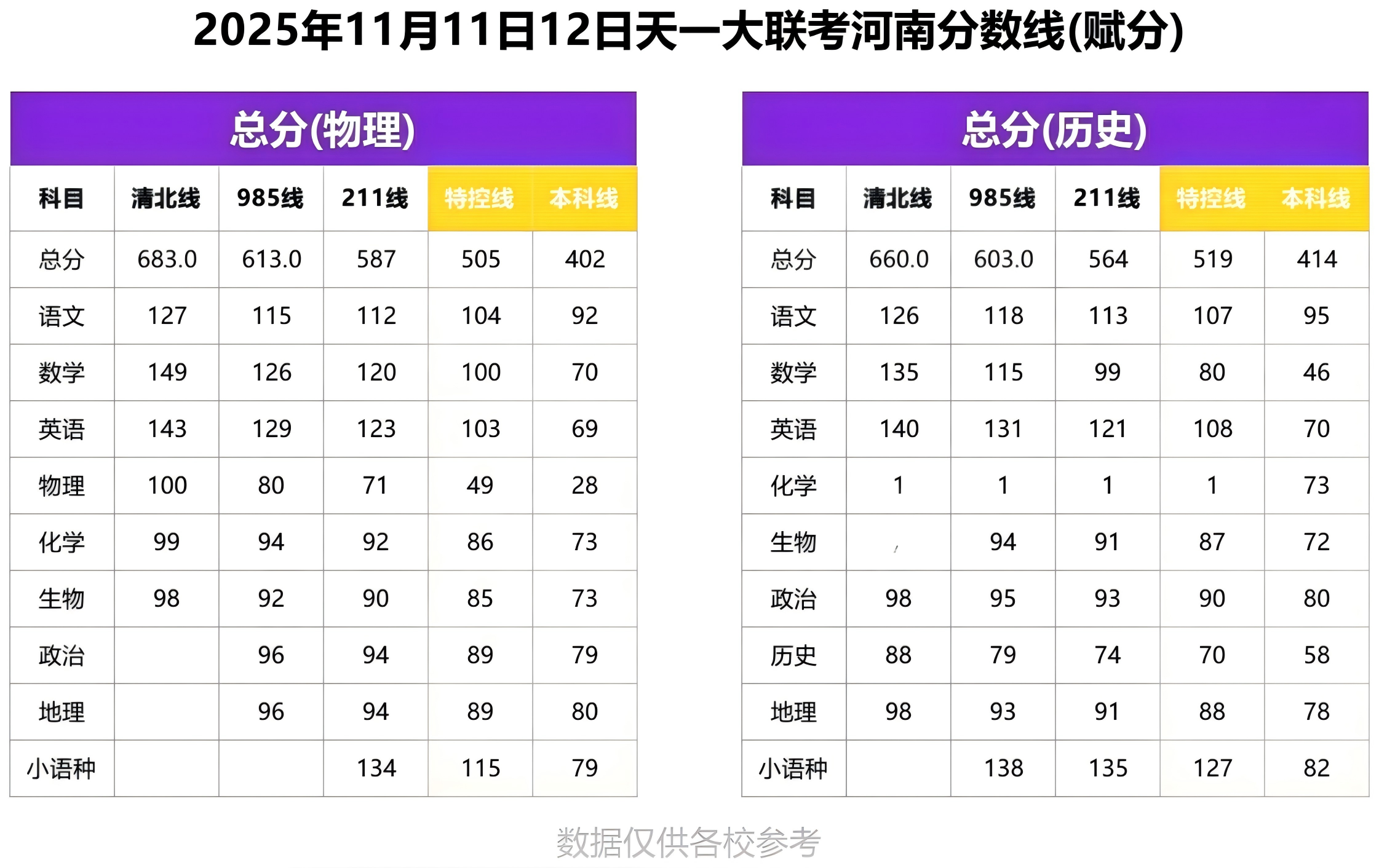 从总分来看,物理类各层次分数线均高于历史类,尤其在顶尖层次分差显著,例如物理类清北线为683分,高出历史类23分,反映出理科高分段竞争更为激烈。然而,在本科线上,历史类(414分)反而略高于物理类(402分),说明文科在中低分数段考生密度可能更大,基础竞争不容忽视。