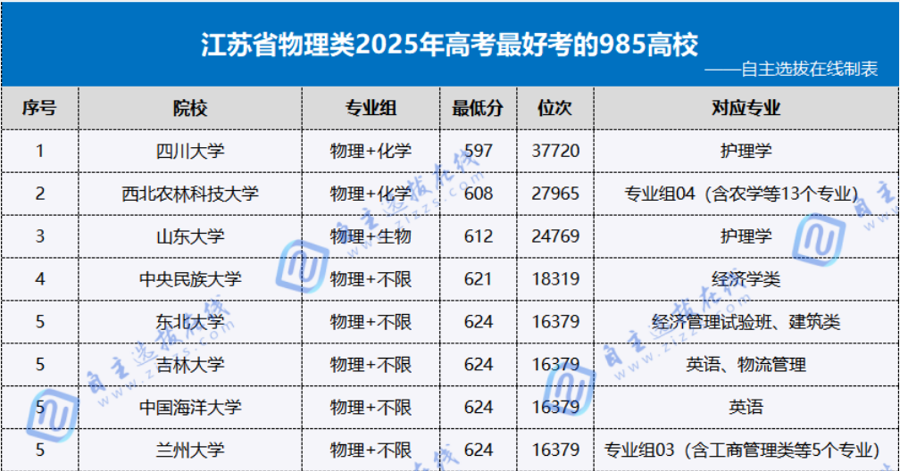 江苏省物理类考生最好考的几所985高校分别为四川大学、西北农林科技大学、山东大学、中央民族大学、东北大学、吉林大学、中国海洋大学、兰州大学。观察2025年各高校在江苏的录取情况,位次38000左右的考生都有机会考上985高校!