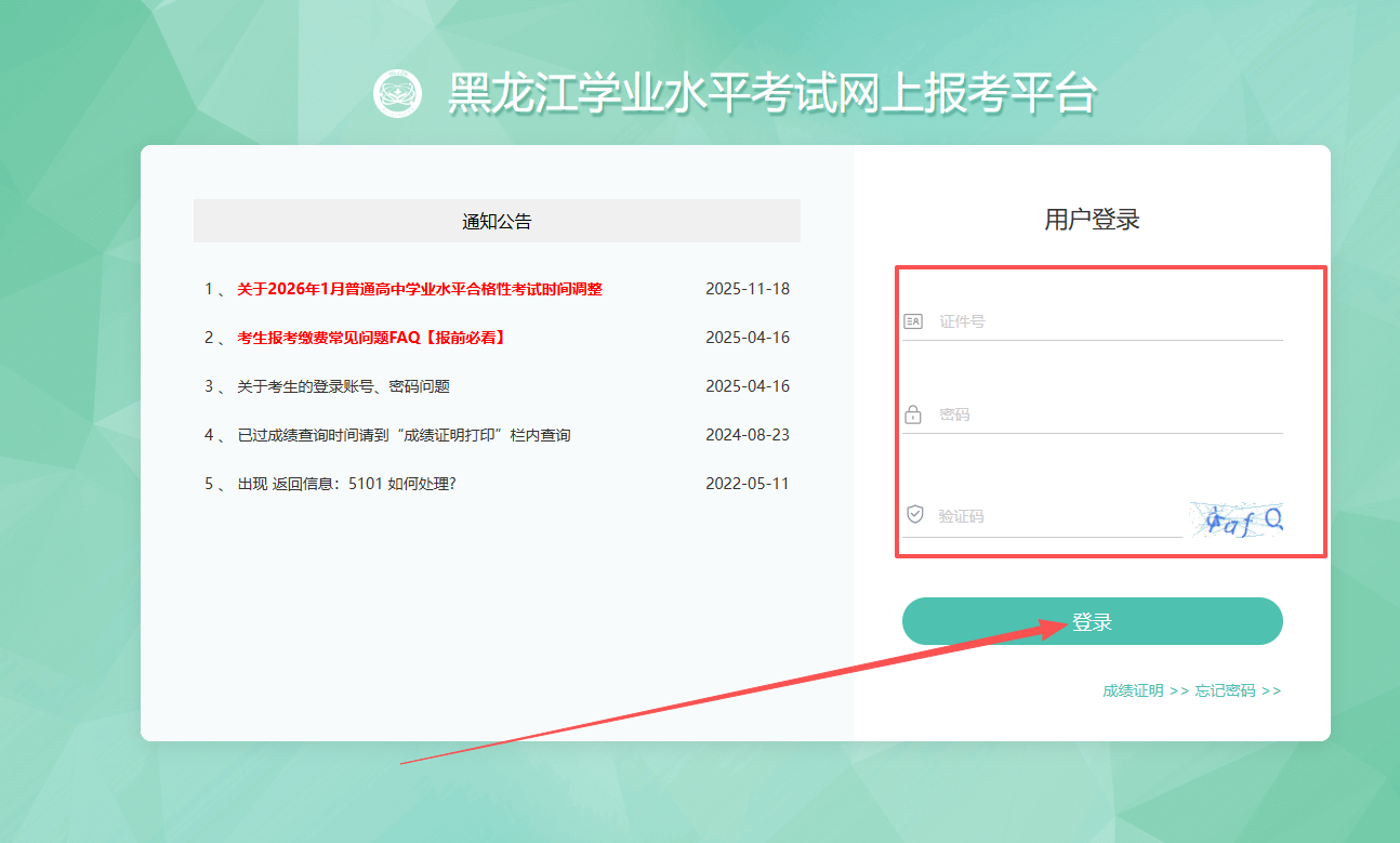 ②直接登录黑龙江学业水平考试网上报考平台(https://xysp.hljea.org.cn/login),按要求填写相关信息后查询成绩。