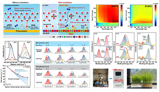 氨不仅是重要的化工原料和农业肥料,更是一种极具潜力的氢能载体。传统制氨工艺能耗高、碳排放量大,亟需绿色转型。光催化氮还原反应以太阳光能驱动,在温和条件下将氮气转化为氨,被视为理想的绿氨合成路线之一。在水相光催化体系中,水既是反应物,也是溶剂,催化剂表面与局域水分子之间的氢键网络对质子供给、氮气吸附与活化、反应物传质等关键过程具有重要影响。然而,如何平衡氮气活化效率、质子供给能力与质子传输速率之间的复杂关系,是当前光催化固氮领域面临的核心挑战。 针对上述问题,团队在前期工作的基础上,在本工作中提出通过调控金属有机框架材料局域微环境协同优化氢键网络与配体—金属电荷转移效应的新策略。研究团队以铋基金属有机框架材料为研究对象,选用具有更强π电子离域能力的均苯三甲酸配体,增强了配体—金属电荷转移效应,促进了光生载流子的分离与迁移,结合铋原子独特的电子结构,显著提升了对氮气的吸附与活化能力。研究发现,在弱碱性反应环境中,体系不仅维持了较高的质子传输速率,还通过阳离子水化效应形成了高效的传质通道,促进了氮气向活性位点的迁移。原位光谱与理论计算结果表明,在光照条件下,催化剂表面的氢键网络发生动态演化,释放出自由水分子参与水氧化反应,显著增强了质子供给能力。上述过程与配体—金属电荷转移机制协同作用,有效推动了质子耦合电子转移过程,实现了氮气活化效率、质子供给能力与质子传输速率三者的动态平衡。该光催化体系在常温常压下实现了258.86 μmol·g?1·h?1的氨合成速率。进一步地,研究团队将反应后的溶液用于水培小麦幼苗的培育实验,结果显示,与蒸馏水培养的对照组相比,以反应后溶液培养的小麦幼苗在发芽、根系发育、茎叶生长等方面均表现出显著优势,展现出良好的应用前景。此外,通过旋转蒸发浓缩,可将反应溶液中的铵盐富集至约200 mg·L?1,为产物的进一步利用提供了可行路径。 中国海洋大学化学化工学院、海化教育部重点实验室为该研究成果的第一完成单位,孟祥超教授为唯一通讯作者,文章第一作者为2024级海洋化学工程与技术专业博士生李同。研究工作得到了国家自然科学基金、山东省自然科学基金、青岛市自然科学基金以及海大优秀青年科技人才培育计划等项目经费的大力支持。