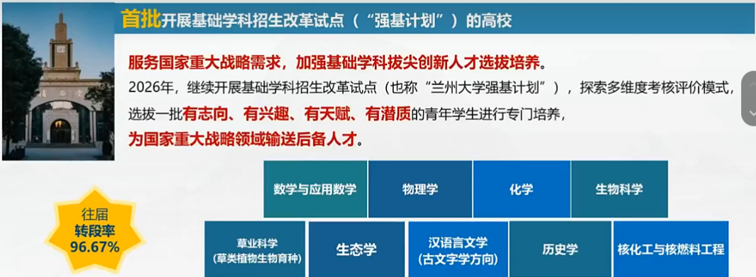 2026年兰州大学招生宣讲会中,对于学校强基计划招生专业以及相关政策截图如下: